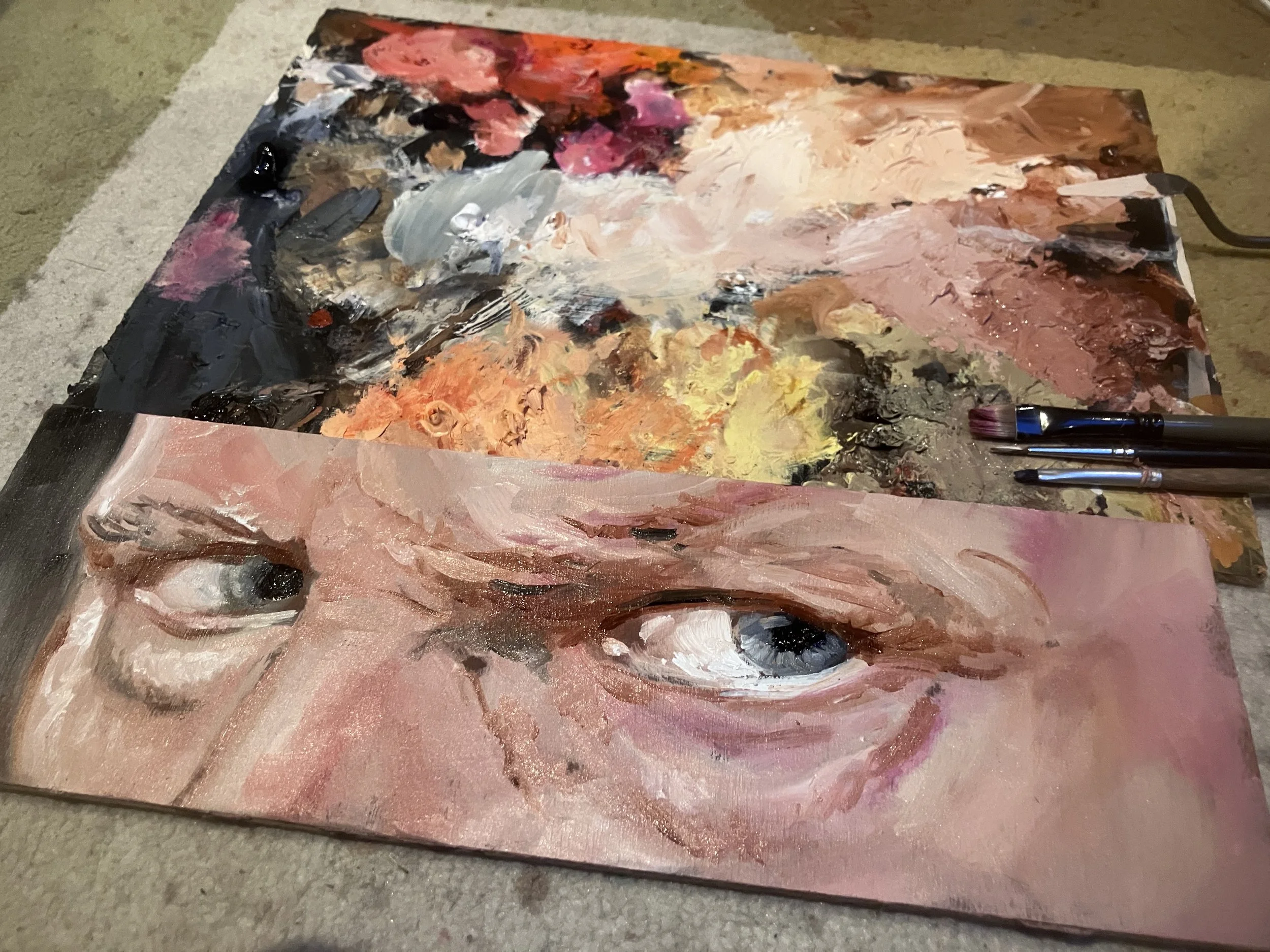 Pour cette huile sur toile (40F) 81×100 cm, je réalise un autoportrait. Mon idée est de me mettre en scène pour l’affiche de l’exposition solo de fin août à début septembre (2026) qui aura lieu à la galerie Poscia à Hyères.