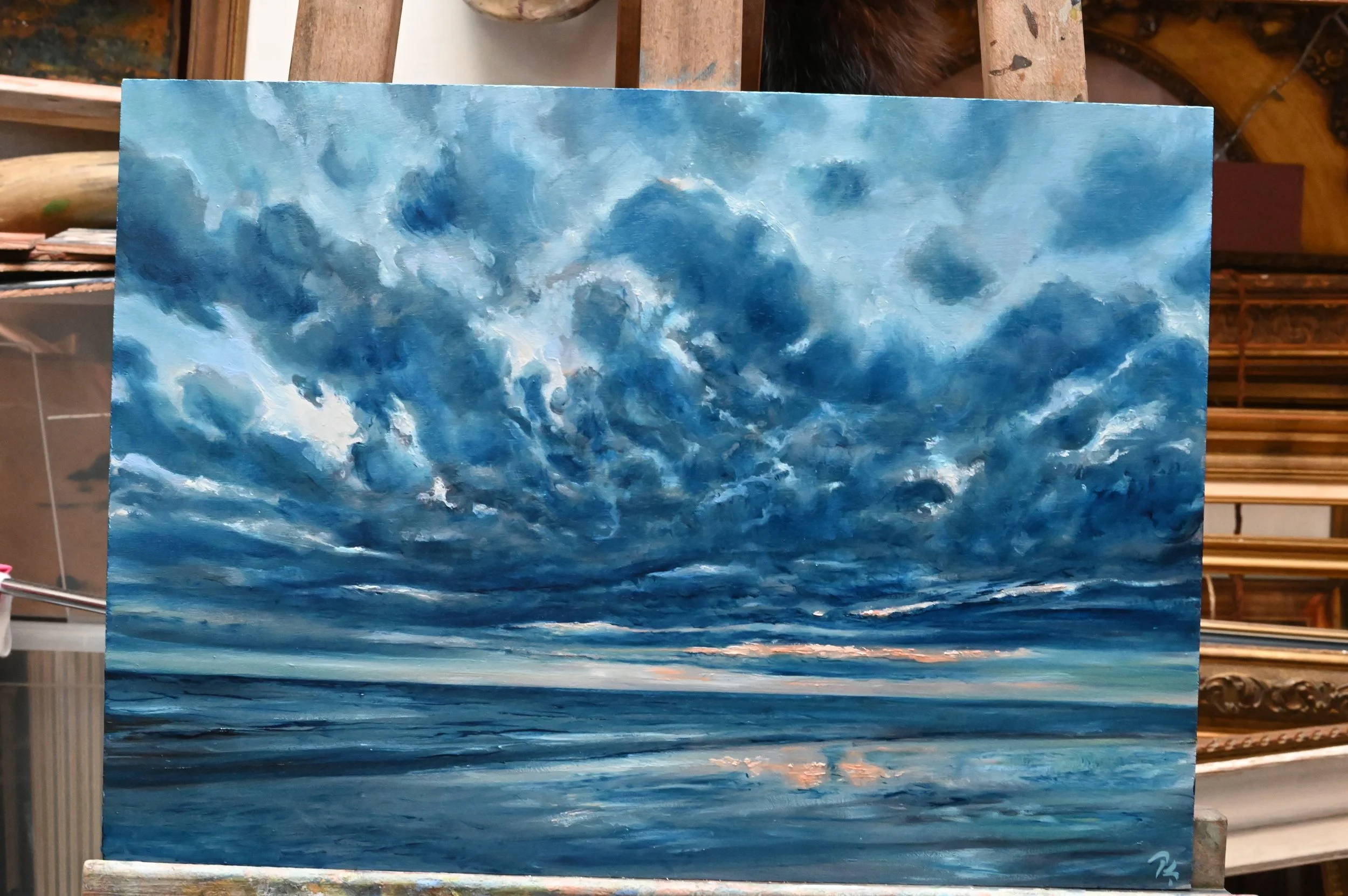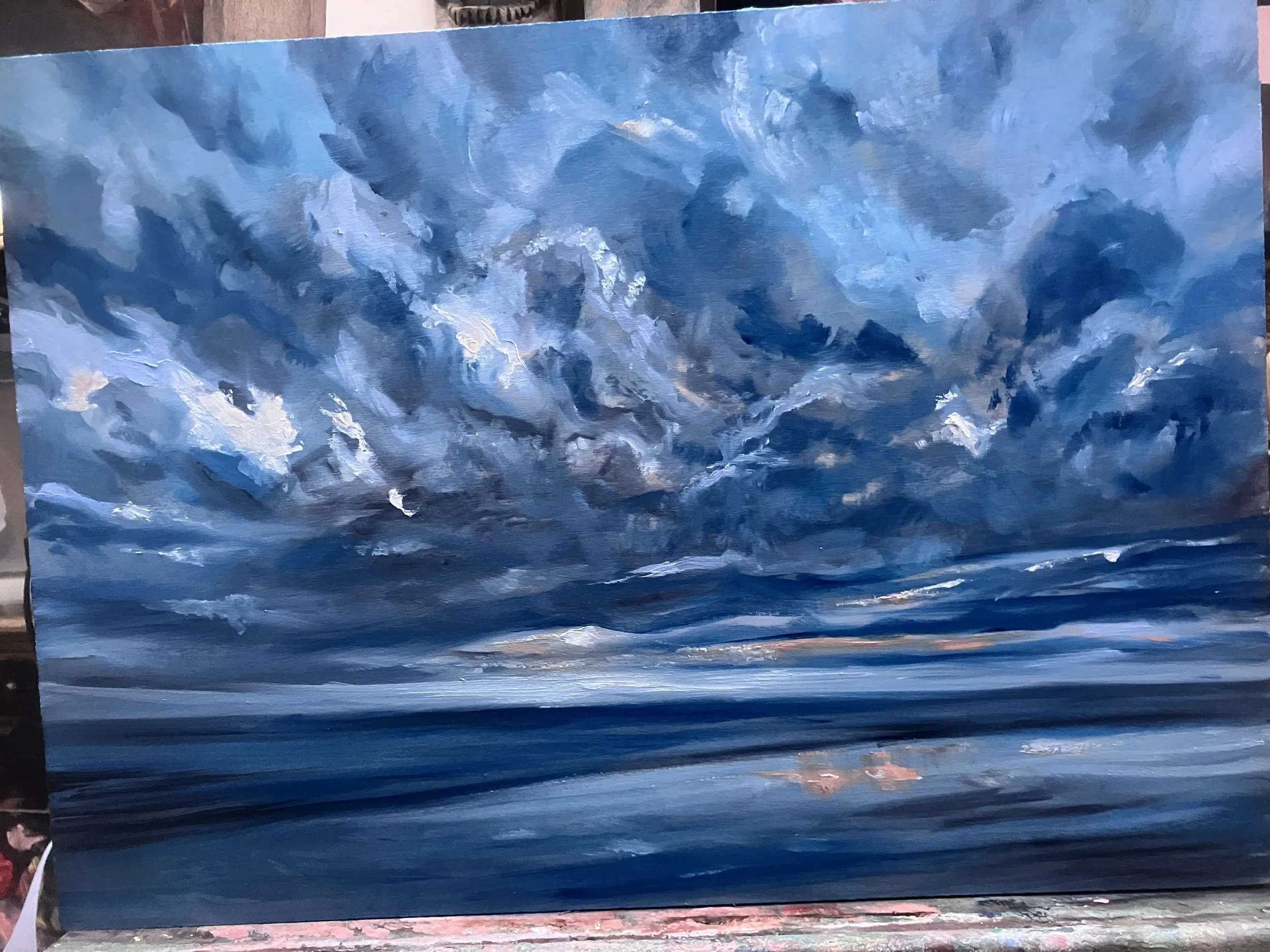 Le week-end dernier je me suis aperçu, qu’il me rester quelques supports apprêtés, donc me voilà lancer dans la peinture d’un ciel du 17 août 2023.
